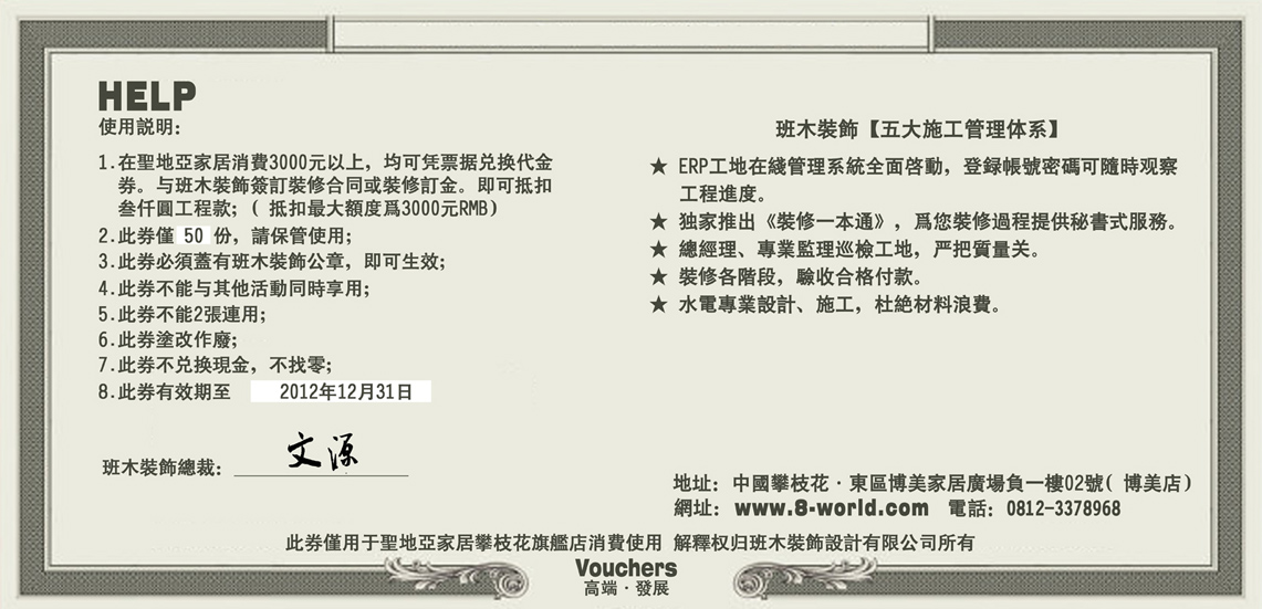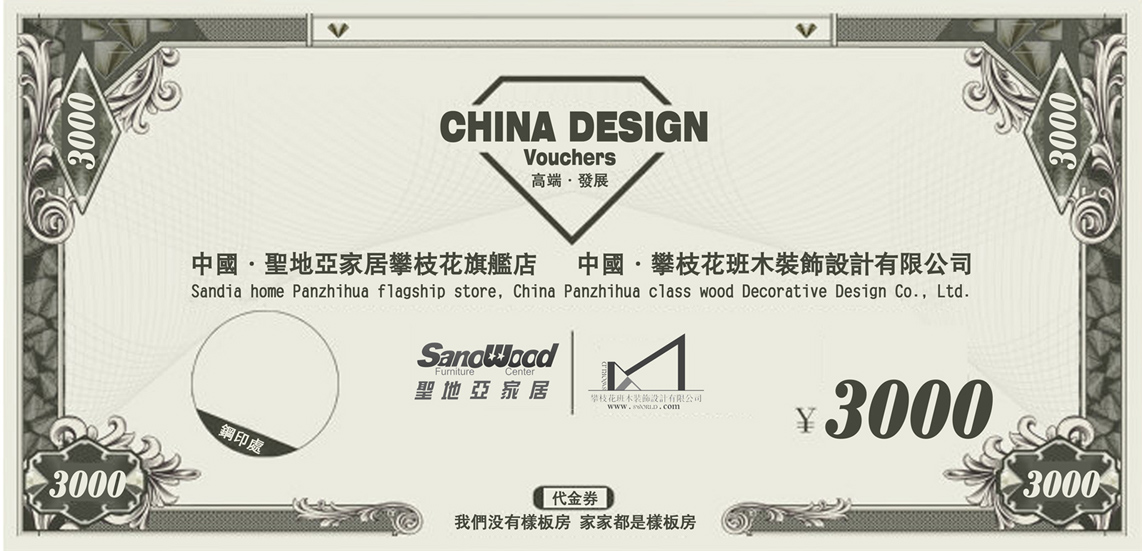 1.在圣地亞消費均可憑票據兌換【代金券】。與班木裝飾簽訂裝修合同或裝修訂金。即可抵扣叁仟圓工程款。(抵扣最大額度為3000元。)